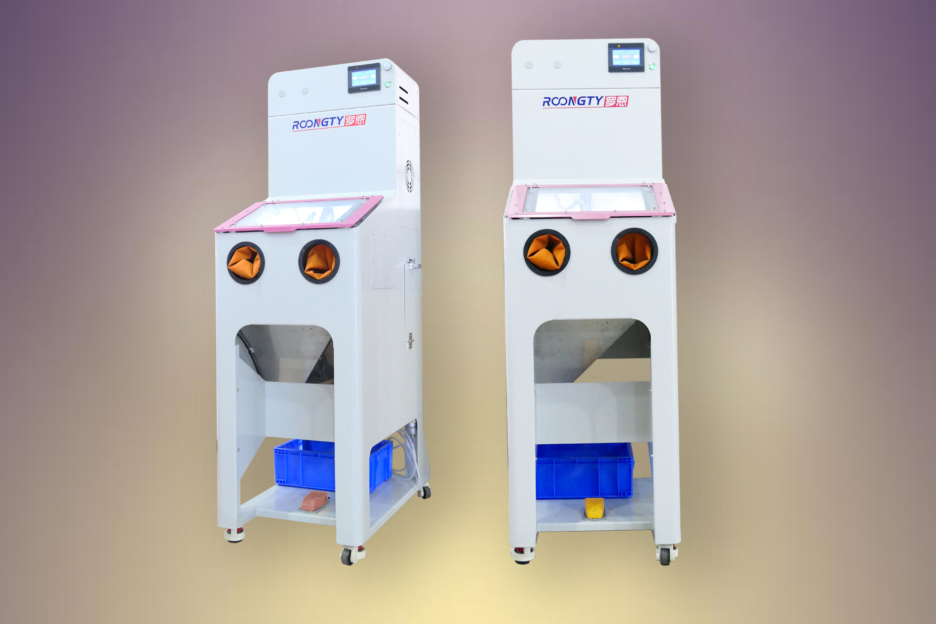 罗恩镜面喷射的原理是以皮带运输方式,输送磨料进入磨料喷射系统,通过叶轮离心力甩射磨料,使磨料以滚动方式与抛光工件接触,进而达到抛光效果